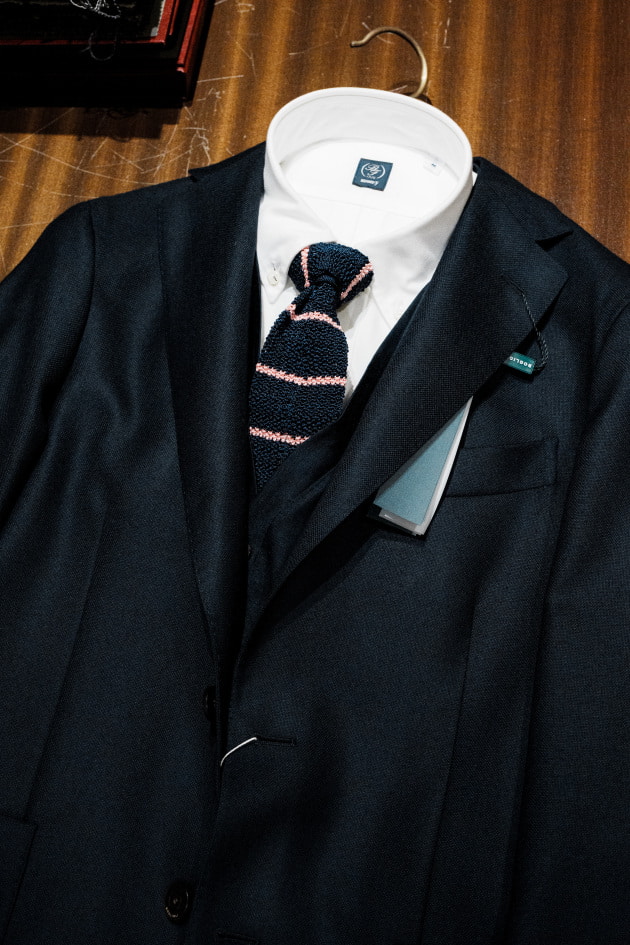 ちなみにこちらは別注モデル。生地・ボタン・サイズバランスに調整を加えています。