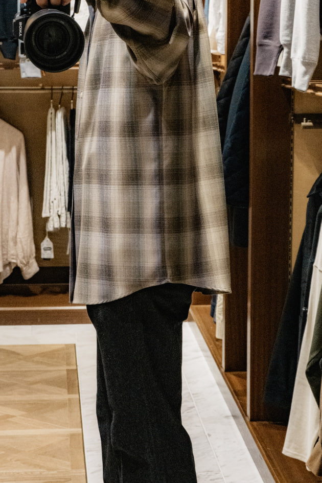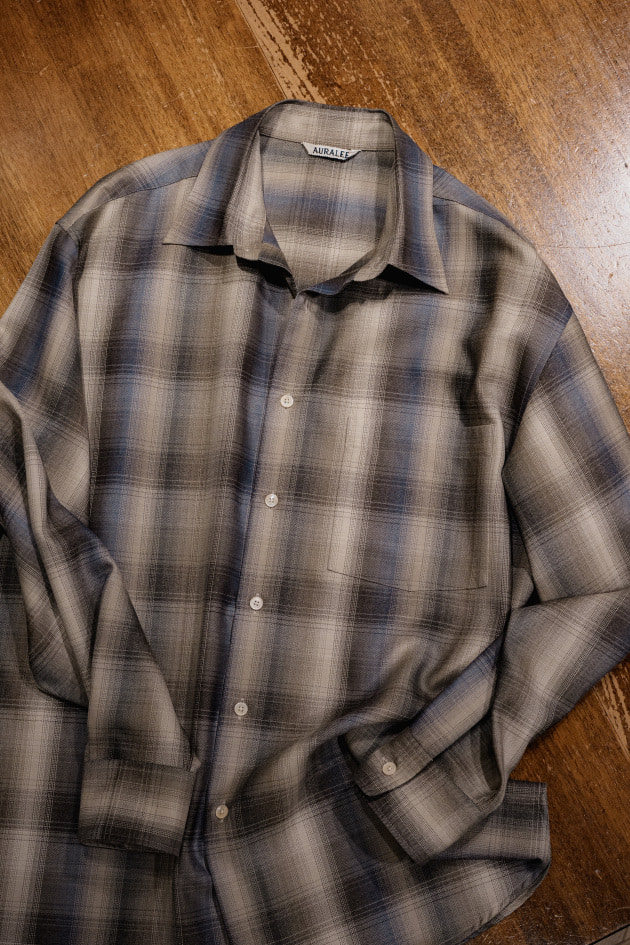 こちらはブランドの定番素材のひとつである、極細番手ウールのチェック生地を用いた長袖シャツ。ウールの快適さを日常着に落とし込んだ、<AURALEE>らしい一枚です。