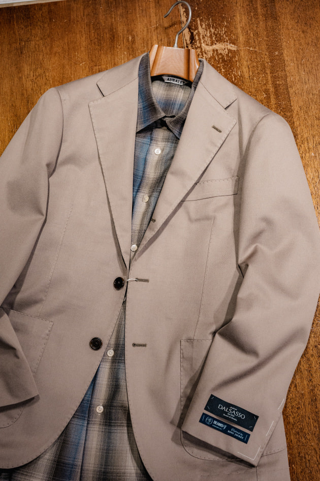 こちらは最近入荷してきた<BEAMS F>EASYシリーズのコットンスーツですが、先月オーダーしたベージュのスーツに合わせるイメージです。