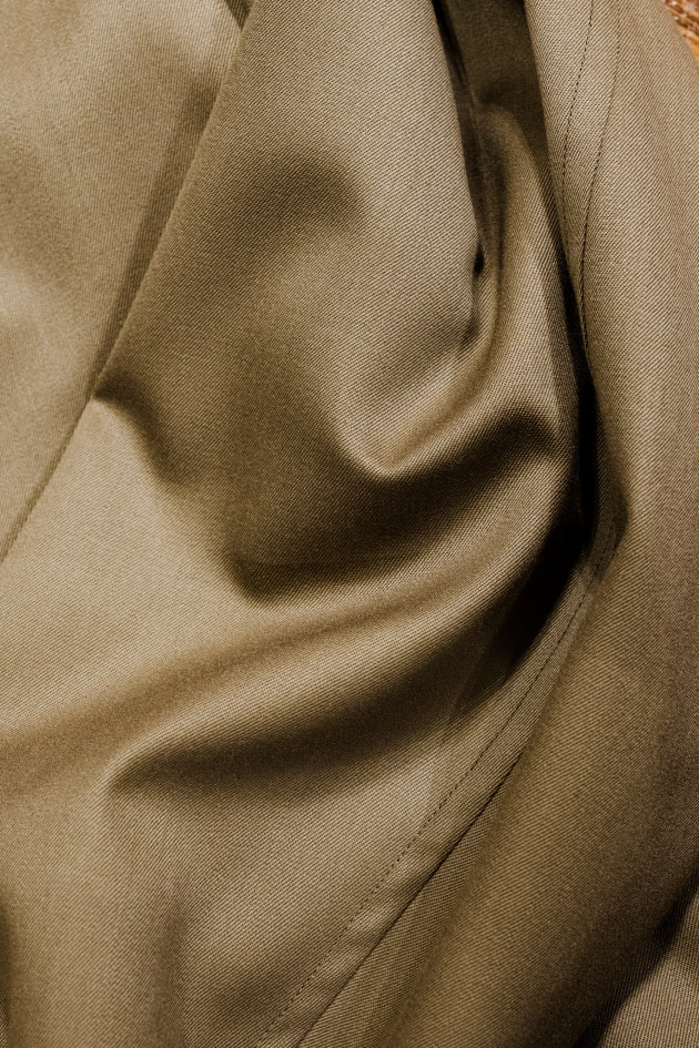 以前はしっかりとしたコットンギャバジンを載せていた同モデルですが、ウールギャバジンになることで綺麗なドレープ感が生まれ、非常にエレガント。