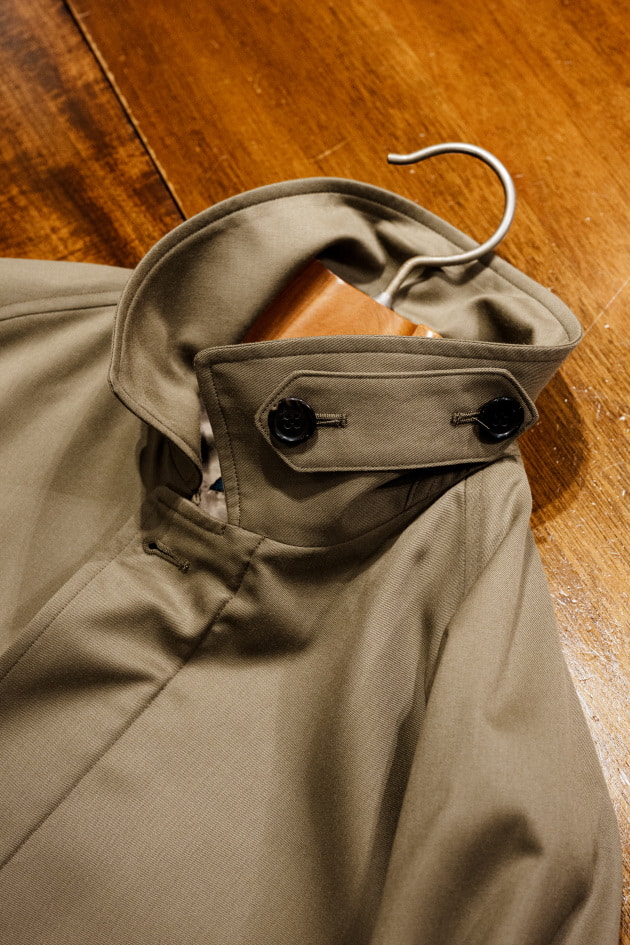 以前はしっかりとしたコットンギャバジンを載せていた同モデルですが、ウールギャバジンになることで綺麗なドレープ感が生まれ、非常にエレガント。