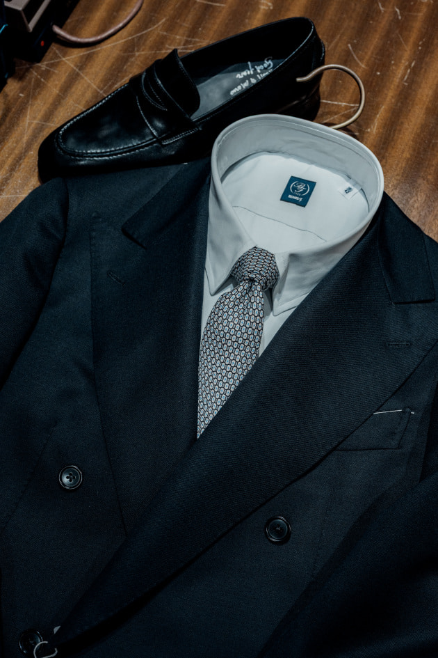 言い訳すると、こういうダブルのスーツをボタン留めずに着用することでスポーティに見せる着こなしが好きなのでこういう合わせをするときはそういう着こなしで行きたいなと思っております。もしくは<HUSBANDS>のようなスーツのシェイプに特徴があるものとかがいいですね。