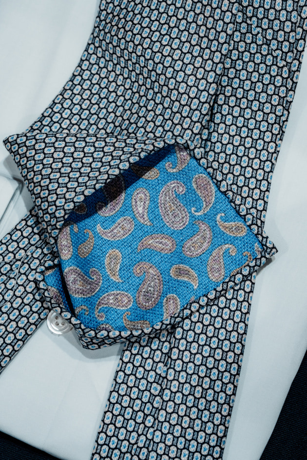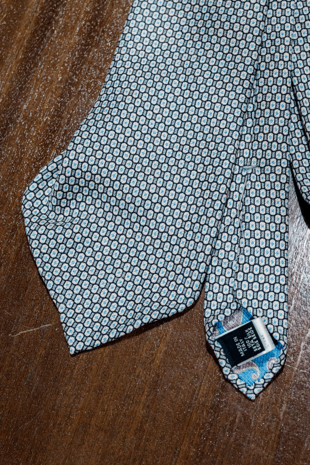 大剣先がピシッと折られておらず、ふわっとしているのも特徴で、プリントは細かな小紋柄でヴィンテージ感を漂わせつつも、どこかモダンなバランス。非常に優雅でエレガントな感じは<Atto Vannucci>らしいといえるでしょう。