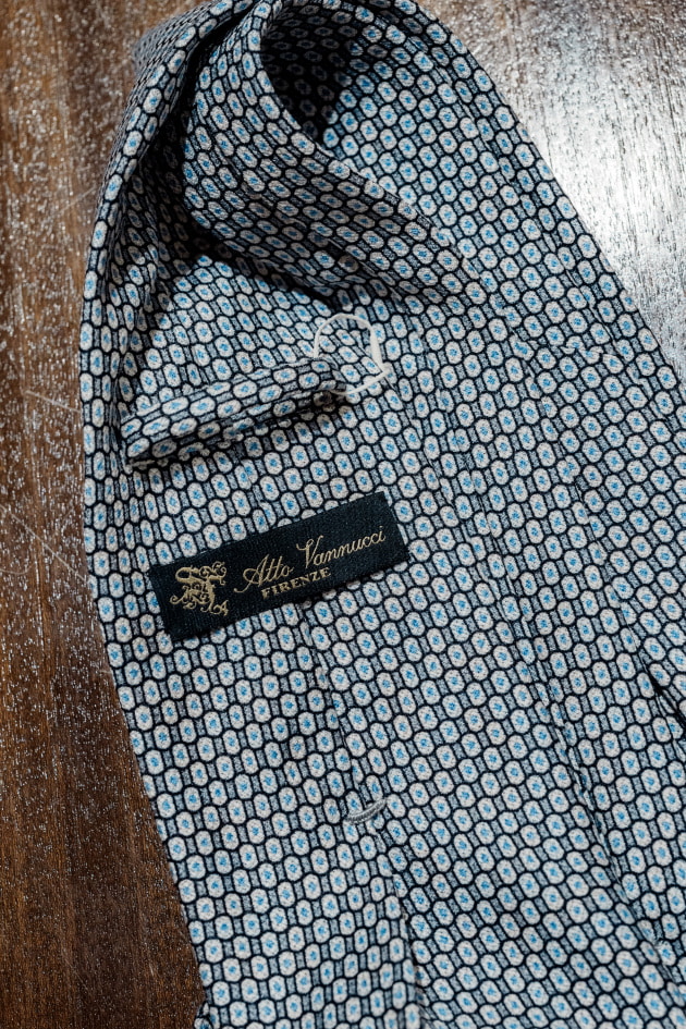 <Atto Vannucci>はシルクのプリントタイ。ブランドらしい洒落た色柄と仕立ての美しさを、ネクタイをより軽快に楽しめるのがこのネクタイの魅力です。