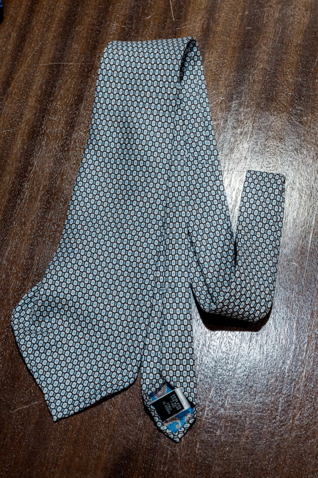 また中途半端に小柄な小紋柄はビジネスでも通用するような真面目見えするのですが、これぐらい振り切ると洒落で着けやすいなと。プリントのマットな質感と相まって、本当にスカーフに近い感覚で着用できるかと。
