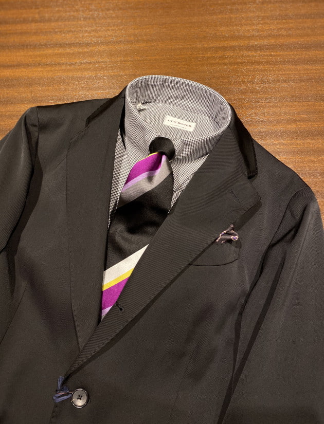 ネイビー地に薄らブラウンが走ったストライプタイが