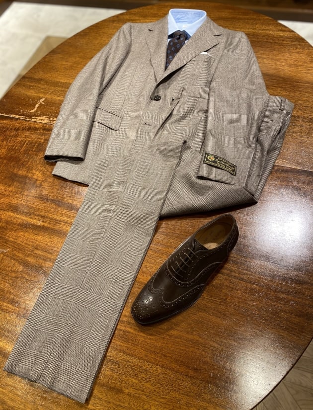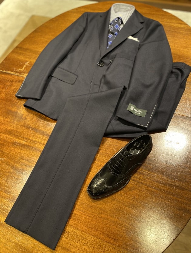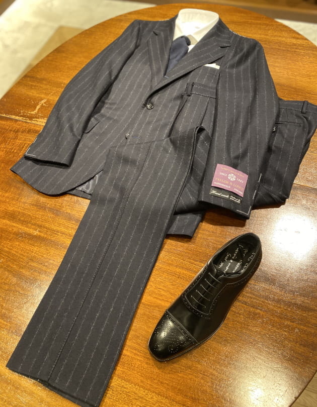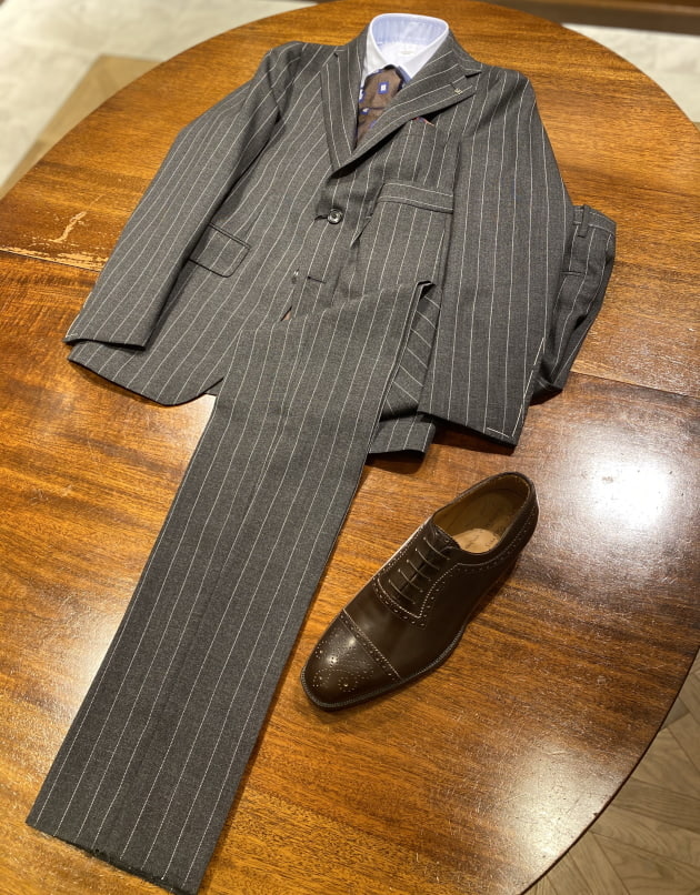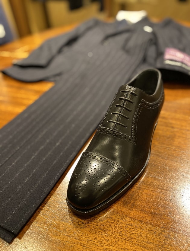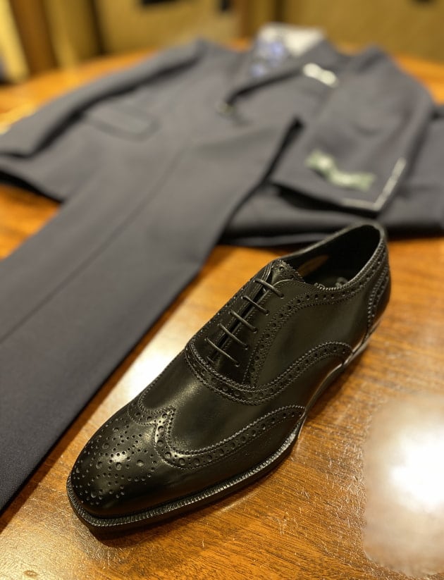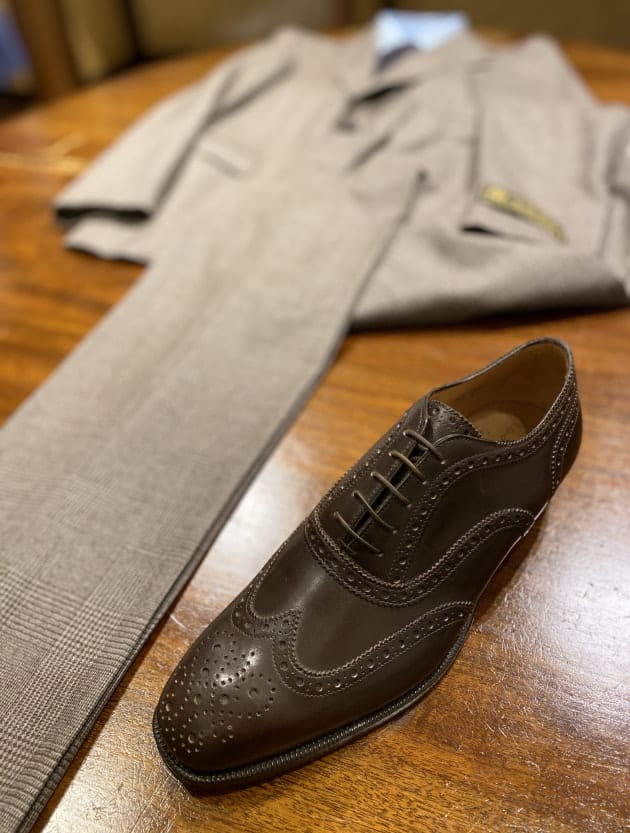 装飾の多いシューズなのでなるべくスーツは無地を、