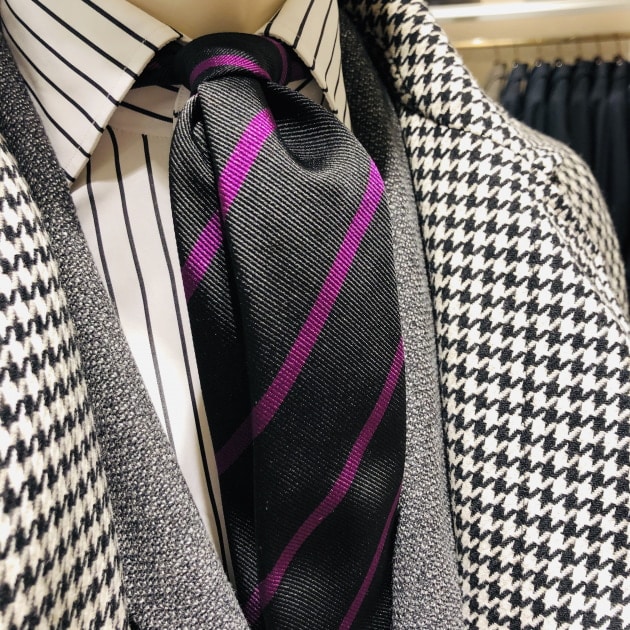 ブラックベースにビビッドなパープルが目を引くこちらは<Drake's>のネクタイ。