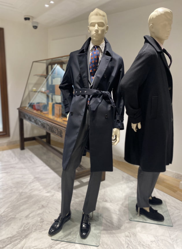 スーツスタイルの上からトレンチコートを羽織り、