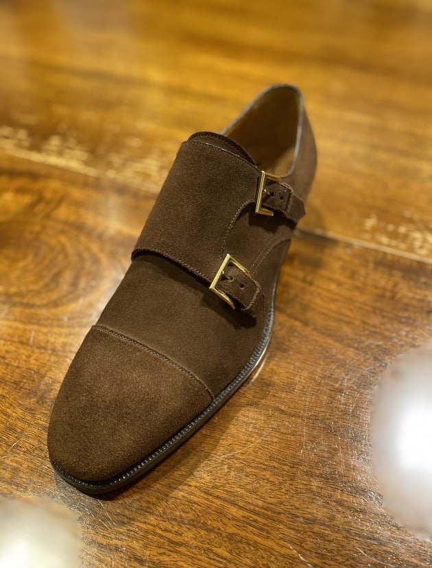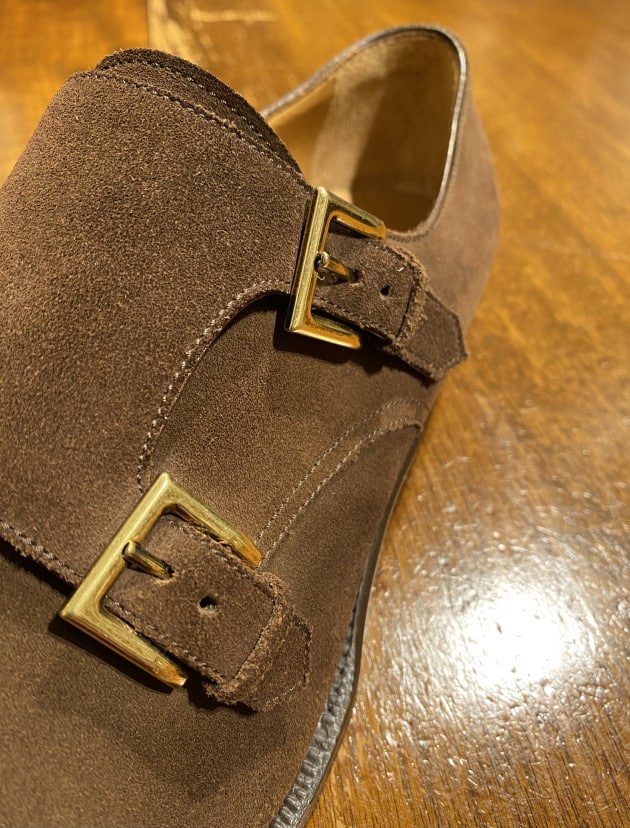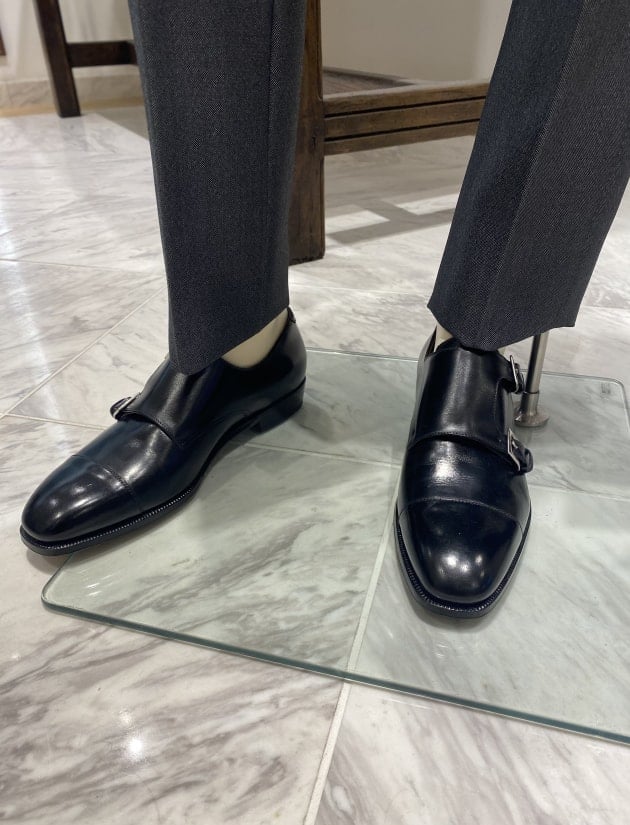 足元はダブルモンクストラップシューズ。