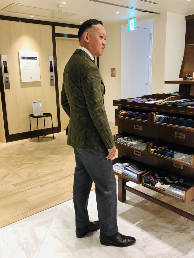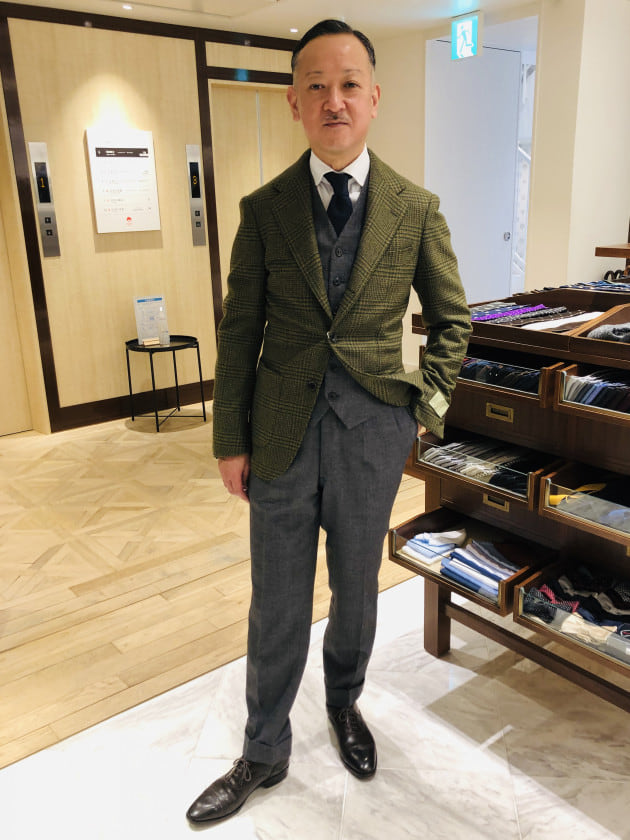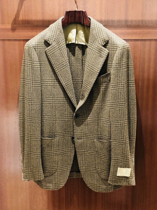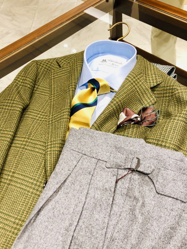 グリーンのグレンチェックが映える一着。グリーンと言っても落ち着いたトーンなので、派手な印象はないですね。