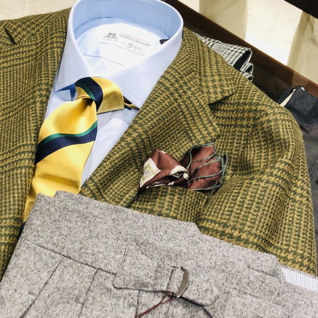 Vゾーンは、ジャケットのグリーンに負けないイエローベースのネクタイをコーディネイト。