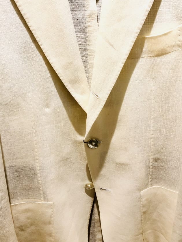 透けそうなほど軽やかな素材。リネンとウールとシルクの混紡。リネン感はありますが、そこまでシャリ感は強くないですね。上品なんです。