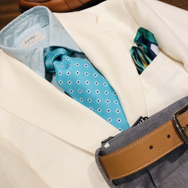 キメキメですね。ターコイズブルーのプリントタイがポイントです。