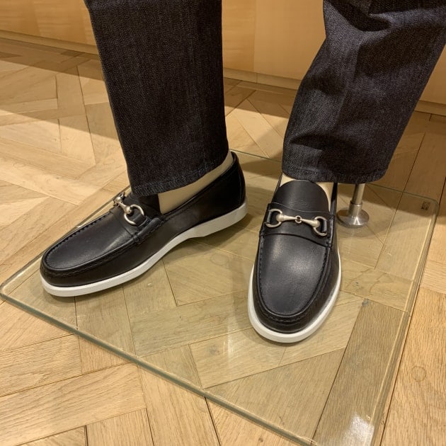 足元にはスペリーソールのビットを合わせました。ホワイトソールで軽さが演出できるローファーですね。