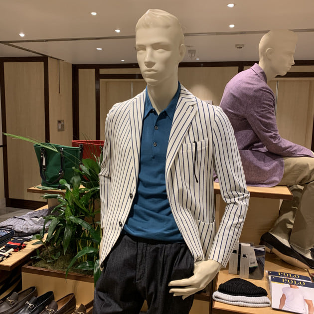 まずはこちらのマネキンから。春らしいカラーリングのストライプジャケットです。