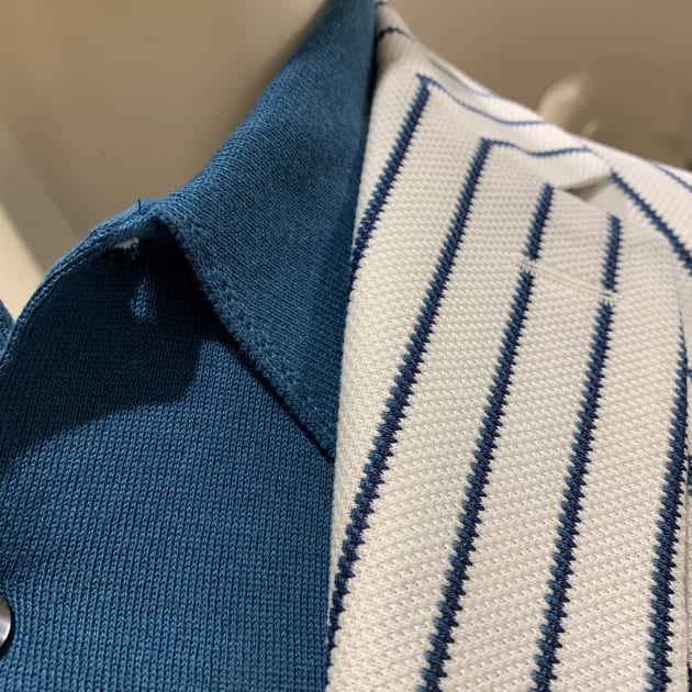 インナーに合わせたのは<JOHN SMEDLEY>のニットポロ。シンプルにストライプの色を拾った合わせです。ターコイズっぽいブルーの発色が今シーズンらしく、ジャケットとの爽やかなコントラストを狙っています。胸ポケットに挿したサングラスもさり気ないポイントですね。