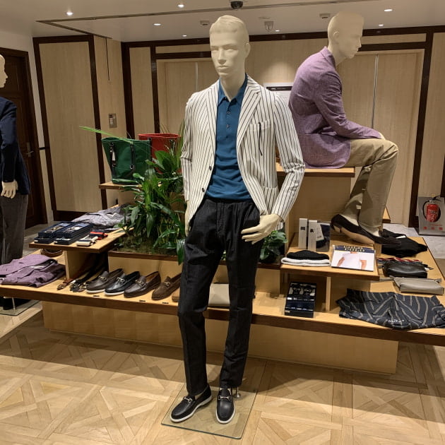 はい、こちらですね。軽めのカジュアルジャケットが人気の<CIRCOLO1901>。4月、5月と活躍してくれそうなジャケットと、セットアップでお召し頂けるパンツをラインナップしております。マネキンのコーディネートを見ていきます。