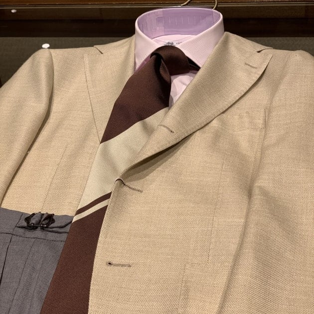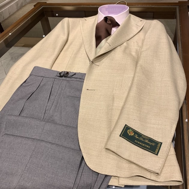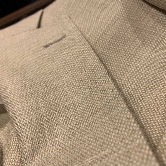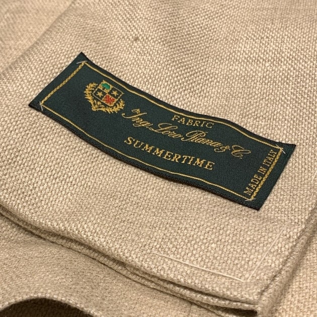 生地はLORO PIANA。ウール65%シルク20%麻12%ナイロン2%ポリウレタン1%。複数素材のミックス生地、ベージュホップサックです。非常に軽やかでサラっと柔らかいタッチ。