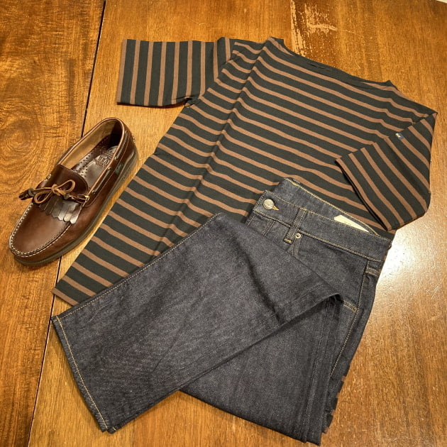 ネイビーの印象が強いマリンルックを、ブラウンで纏めました。