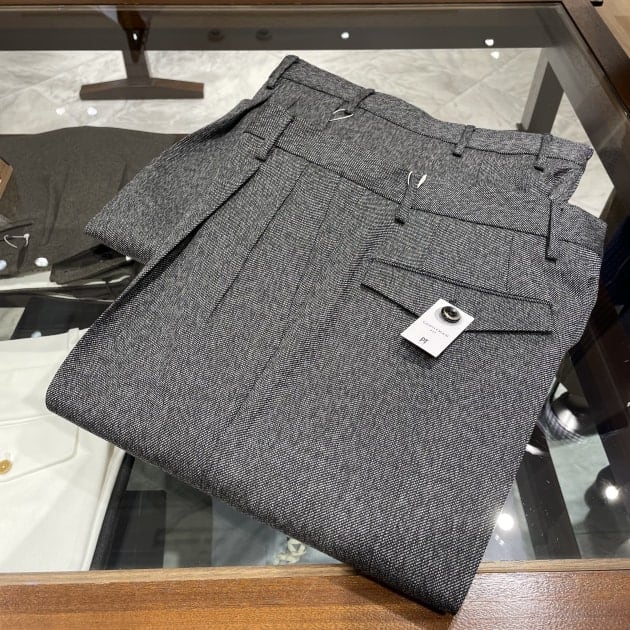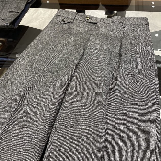 ジェントルマンFITモデルのワイドシルエットです。ウール100%のカルゼー生地を用いたワイドスラックス。