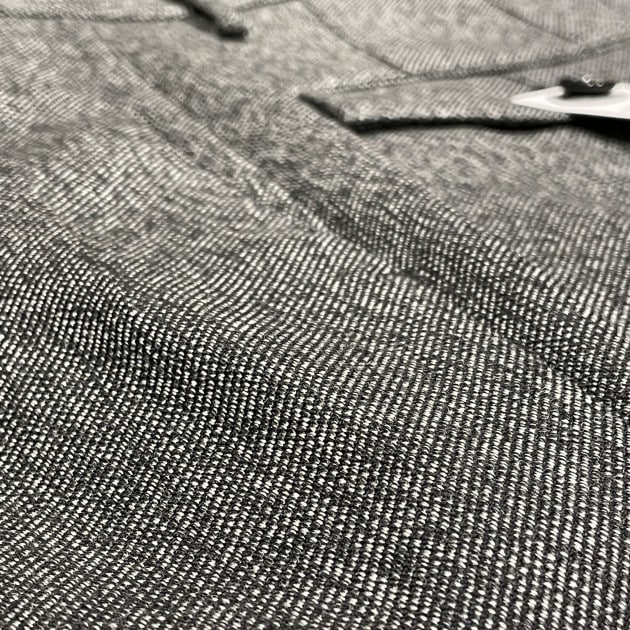シルエットやディティールもさることながら、特筆すべきは生地ではないでしょうか。ウール100%のカルゼー織り。色表記はチャコールですが、モノトーンの濃淡で構成された独特の柄出しが非常に良い感じです。