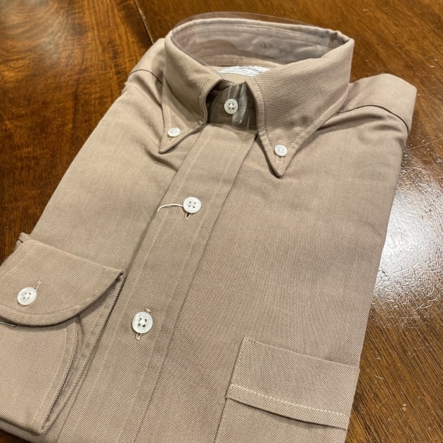 定番のボタンダウンから。ダークベージュのコットンツイル。なかなか他ブランドの商品にはない発色の生地ではないでしょうか。意外とソフトなタッチも良いです。