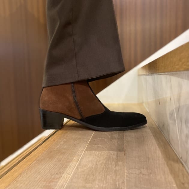 こちらのブーツ、タバコスエードとブラックスエードのコンビなので、洋服が茶でも黒でも紺でも合わせることができる優れ物なんです。
