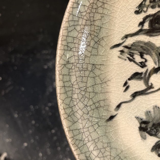 表面に見られる不安定なひびは、鉄分を含んだ釉薬を用いる事で、素材と釉薬の収縮率の差によって生まれています。このひびに墨を塗り込むことで黒く浮かび上がって見えるのだそうです。格好良いけど、繊細な仕事ですよね。