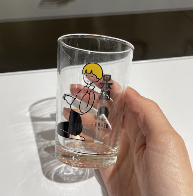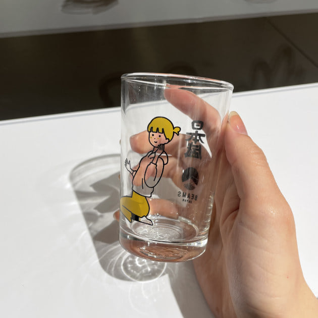 日本酒をコップ酒として楽しむためのガラス製の酒器も登場。女の子の少しおとぼけた顔がたまりません。