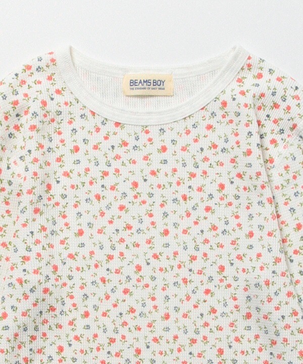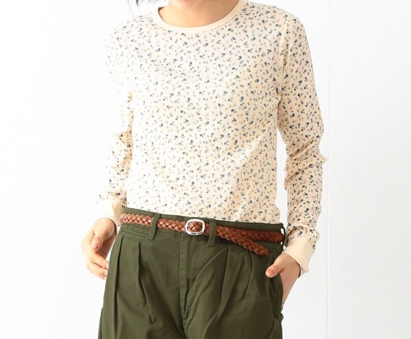淡く小さめのフラワープリントが可愛らしい一枚。長めの着丈に作られており、レイヤードスタイルにももってこいです!