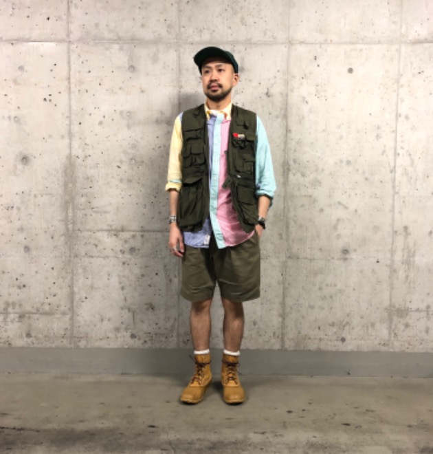 ストライプのボタンダウンシャツに1プリーツショーツにアウトドアアイテム。