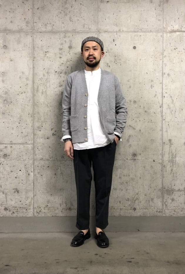 ボタンダウンシャツだと堅く見え、クルーネックTシャツだと少しラフかな?!と思い、インナーにバンドカラーシャツを組み合わせました!