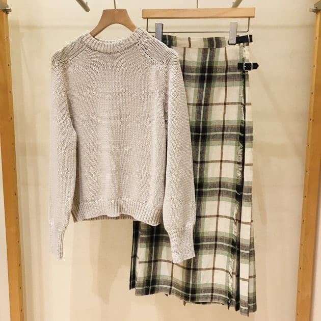 スプリングニット × 《O'NEIL OF DUBLIN》キルトスカートの春らしいコーディネートでいかがでしょう?中にゆったり目のトップスを着れるのも、着用期間が長く取れるので、ポイント高いです。