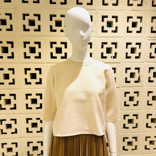 コンパクトな着丈のボックスシルエット。肘まで掛かる、絶妙な袖丈も◎ しっかりとした生地感なので、日中まだ暑さの残るこの時期には、1枚での着こなしもお勧めです。