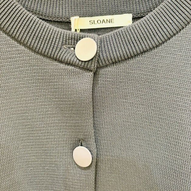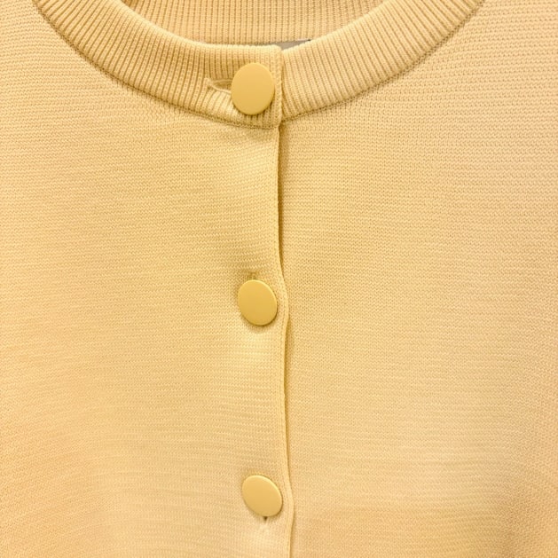 こちらは、伸縮性のある12ゲージのハーフミラノ編みで仕上げた軽やかな質感のカーディガン。