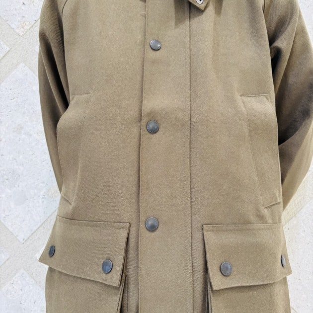 別注ポイントの尾州産ウール100%のタテ×ヨコ30番双糸によるガリウールによる生地感。さらっとよりは、"ざらっと"した粗めの生地感がヴィンテージライクに、秋冬のアウターとして、どこか安心感のある仕上がりとなっております。