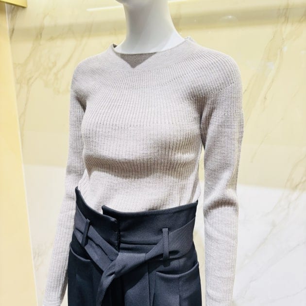 インには、程良く厚みのあるポリエステルウールのリブニットを。ハンサムシックなベルテッドカルゼパンツを合わせたスタイルでいかがでしょう?