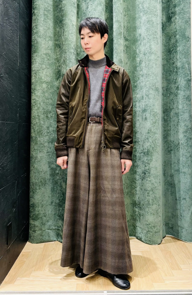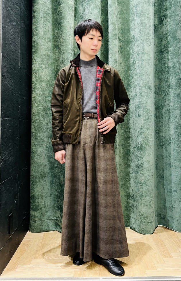 《GRAN SASSO》定番の12ゲージモックネックニットに、私ならボリューム感のあるワイドパンツを合わせて。ブルゾンがコンパクトなゆえ、ワイド目なパンツとも相性抜群ですよ◎