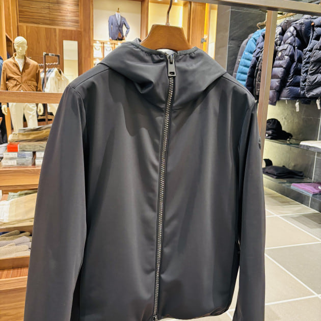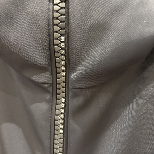 フロントジップに沿うようにあしらわれたブランドロゴトリムが、さりげないアクセントを加えます。