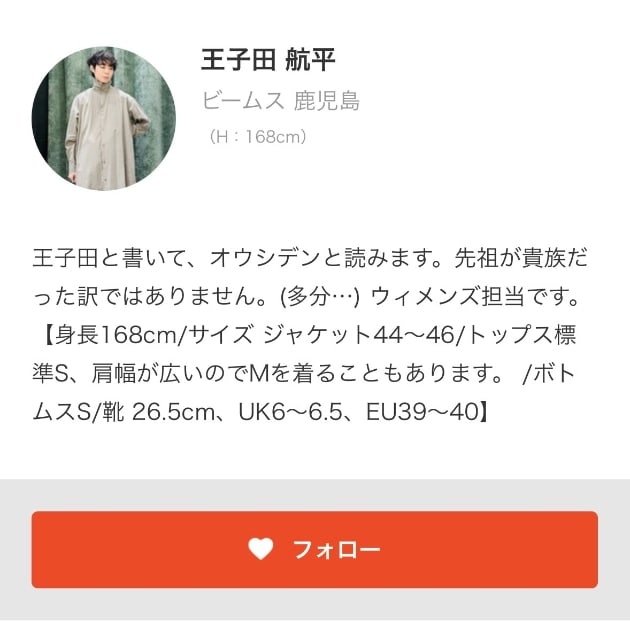 ウィメンズ担当ですが、スタイリング、フォトログでのサイズご紹介、ブログも更新しております。"♡+お気に入り"をしていただくと、見返しやすくなるのと、アクションマイルが50マイル貯まります。さらに、"♡+フォロー"をしていただくと、100マイル貯まります。どうぞよろしくお願いいたします。