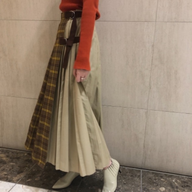 こちらのスカート、無地部分に細かいプリーツがあり、チェックと無地のバランスがとても可愛く仕上がっています。