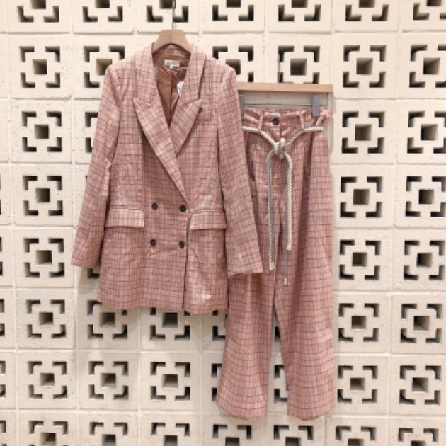 個性的な方には、こちらもオススメです。フェミニンな色合いで、ジャケットの着丈が長めのセットアップ。ピンクのカラーで、おしゃれ感アップ!