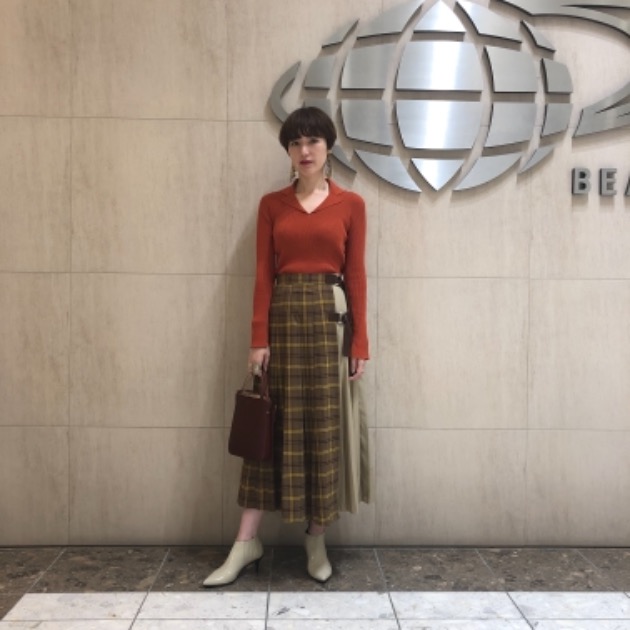 こちらを使用しコーディネート。オレンジ色のニットを中心に、温かみのあるカラーにしました。