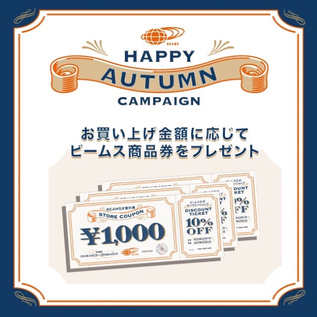 2019年8月31日(土)〜9月30日(月)の期間中に10,000円(税込)以上お買い上げの方に、2019年10月以降にご利用いただけるビームス商品券をプレゼントします。