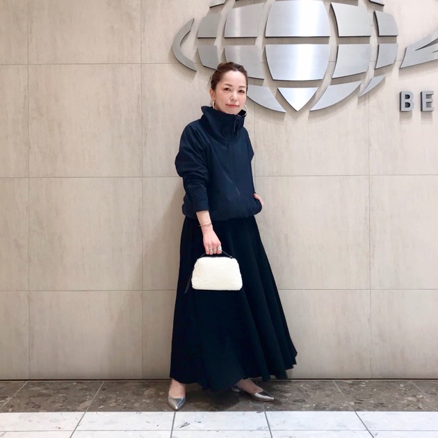 人気のブルゾンと合わせてみました。スカートの柔らかさが女性らしさをプラスしてくれますね。