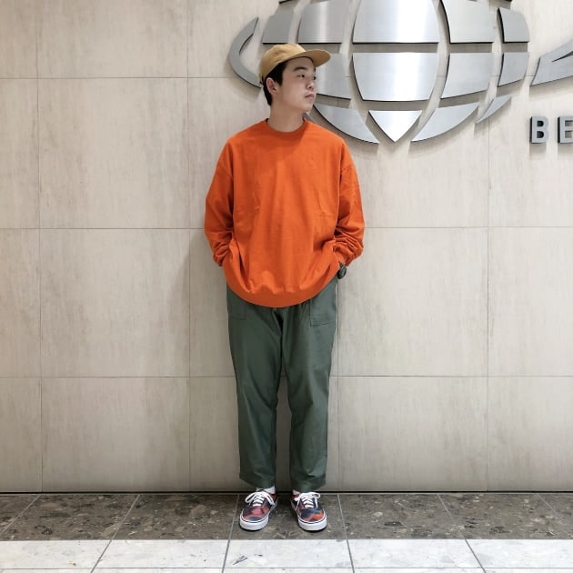 トップスには相性の良いオレンジを。ストリートスタイルの多い児島にもバッチリはまってます。