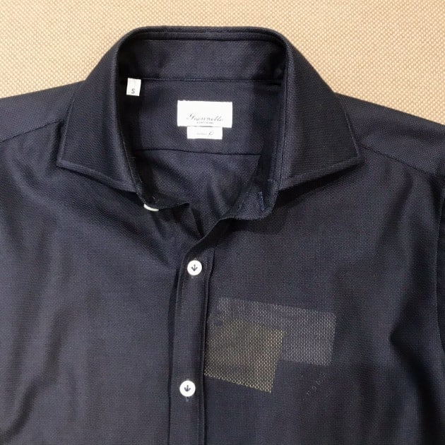 襟はワイドカラー。ボタン開けるとチラっと。