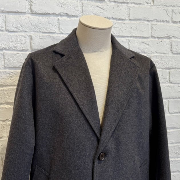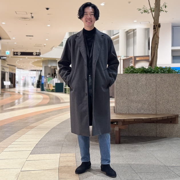 1つ目にご紹介しましたキルティングブルゾンよりもドレッシーな印象ですが、ゆとりのあるサイズ感のコートですので、デニムやチノパンツと合わせてサラッと羽織っていただくだけでも十分サマになるアウターです。