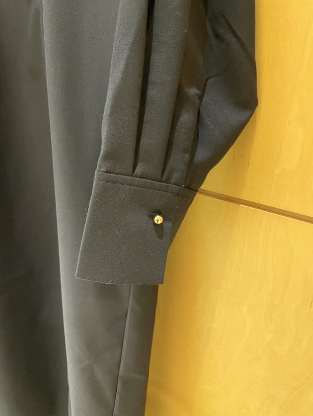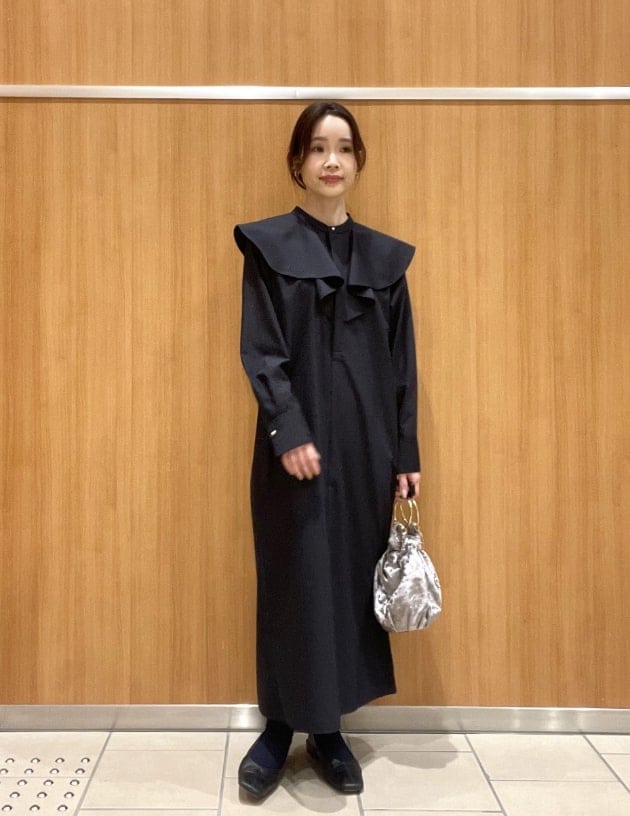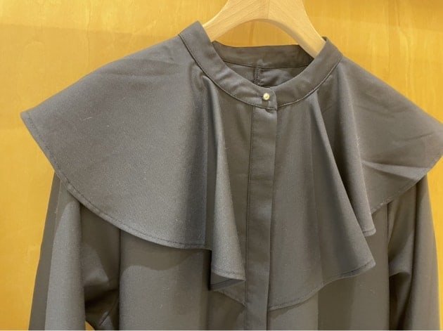 顔周りを華やかに見せてくれる大きなフリルが特徴的で、さりげないゴールドボタンが上品な印象